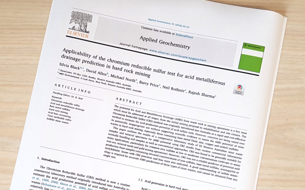 Dr David Allen and Dr Michael North in conjunction with ChemCentre WA have recently had a paper published in the Journal of Applied Geochemistry on the applicability (or otherwise) of using the soils based chromium reducible sulfur (CRS) test in assessment of hard rock mining samples for AMD. In essence, the CRS test may be a useful tool but should be approached with caution and not used in isolation.