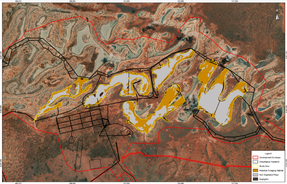 NDVI data was used to quantify vegetation coverage within the area mapped as Salt Lake habitat during baseline fauna assessments recognising that vegetated areas may provide foraging habitat for the species. The assessment utilised remote sensing data from the Sentinel Hub EO Browser, Sentinel-2 L2A (atmosphere corrected) satellite imagery program. Areas were classified as vegetated or non-vegetated playa. Vegetated areas were further classified by landform with only those recognised to be closed depressions being classified as potential foraging habitat.