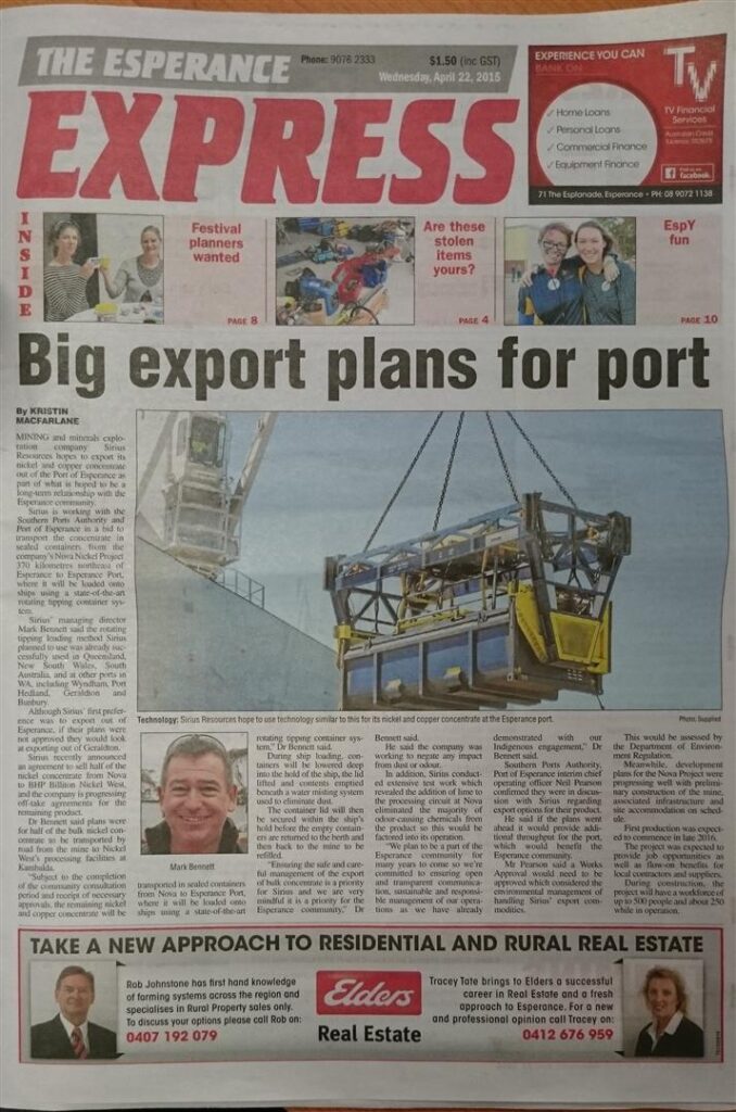 MBS is very excited to be assisting Sirius with development of the Port Works Approval for export of nickel concentrate via Esperance Port and the community consultation process.